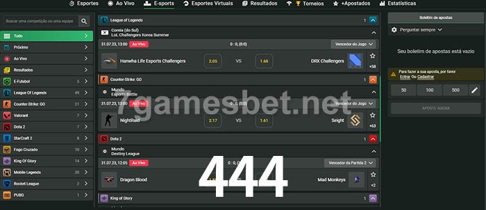 O 444 oferece uma grande seleção de opções de apostas em e-sports com probabilidades competitivas